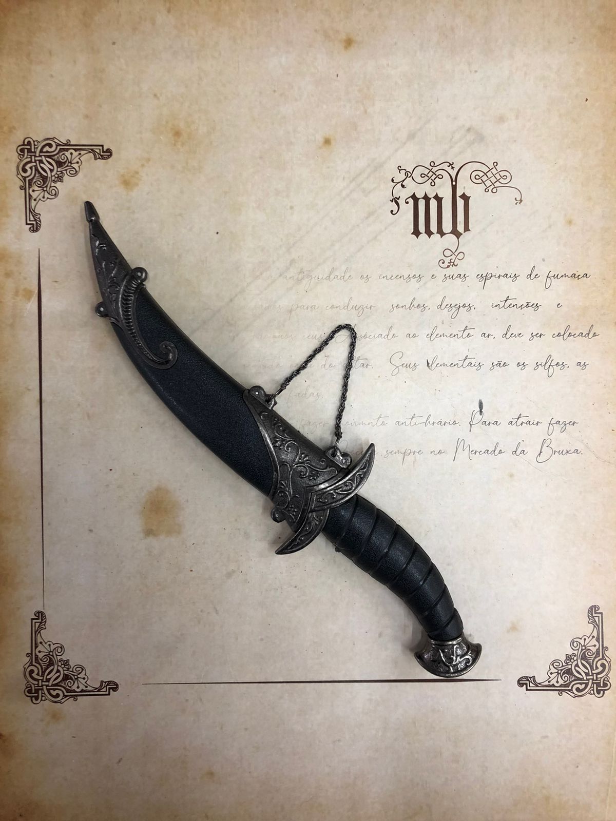 Adaga ou athame: um dos elementos fundamentais em um altar. Esse instrumento é utilizado tanto para abrir o círculo sagrado( no início do ritual), quanto para fechar o mesmo( no fim da ritualística). Sempre feito de ferro, podendo ser afiado ou não.