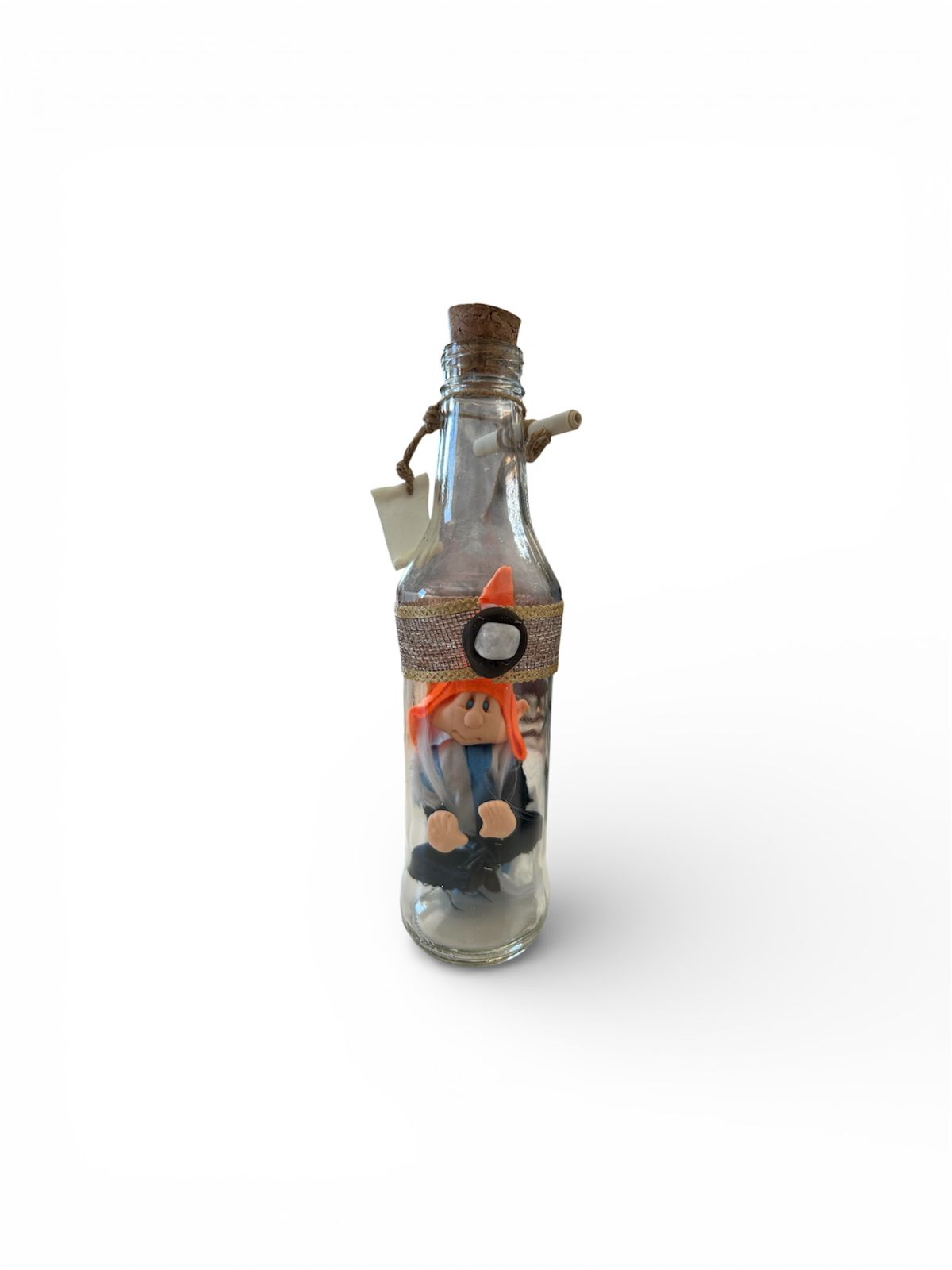 Encerrada em vidro como um segredo antigo, a Duendina na Garrafa carrega a energia lúdica e protetora dos seres elementais. Sua presença desperta o encanto do invisível, lembrando que a magia habita os detalhes, os sorrisos sutis e as pequenas intenções lançadas ao universo.