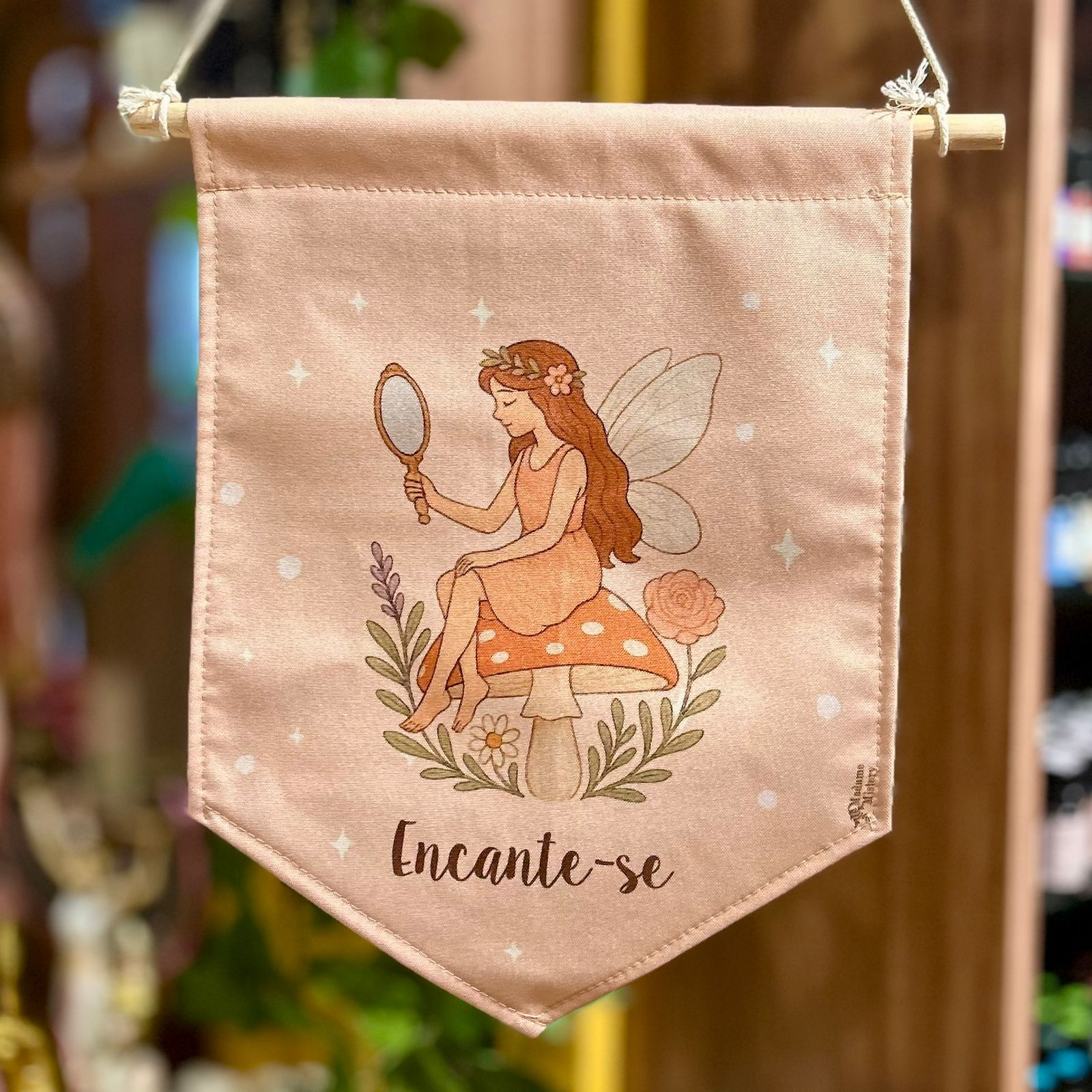Na coleção Jardim das Fadas, cada detalhe foi criado para despertar leveza, magia e encantamento. A Flâmula Encante-se traz a imagem da fada diante do espelho, lembrando que o verdadeiro encanto começa quando reconhecemos a beleza que habita em nós. Uma peça delicada, inspiradora e cheia de poesia para iluminar qualquer ambiente.