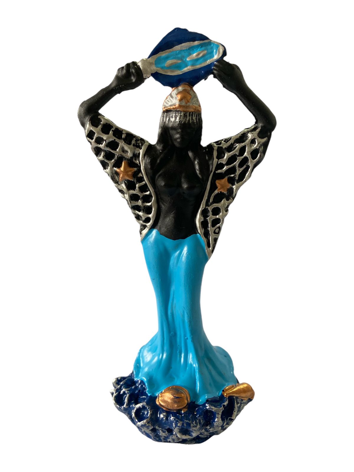 Mãe das águas salgadas, senhora dos mares profundos e dos corações que buscam acolhimento. Esta imagem de Iemanjá representa o amor materno, a proteção e a força serena que flui como o oceano — firme, vasta e eterna.