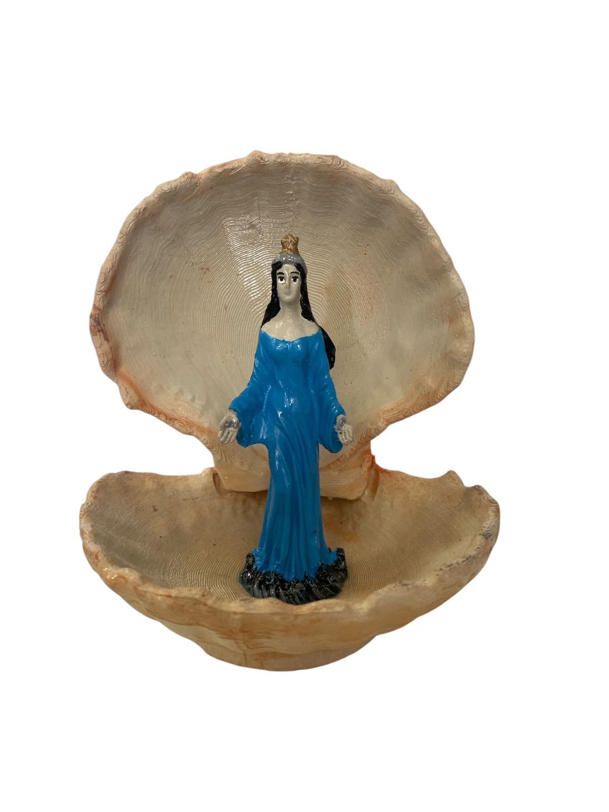 A presença de Iemanjá no incensário, aliada à beleza da concha, representa proteção, purificação e conexão com a energia das águas. A fumaça fluindo suavemente pela concha simboliza renovação e equilíbrio espiritual.