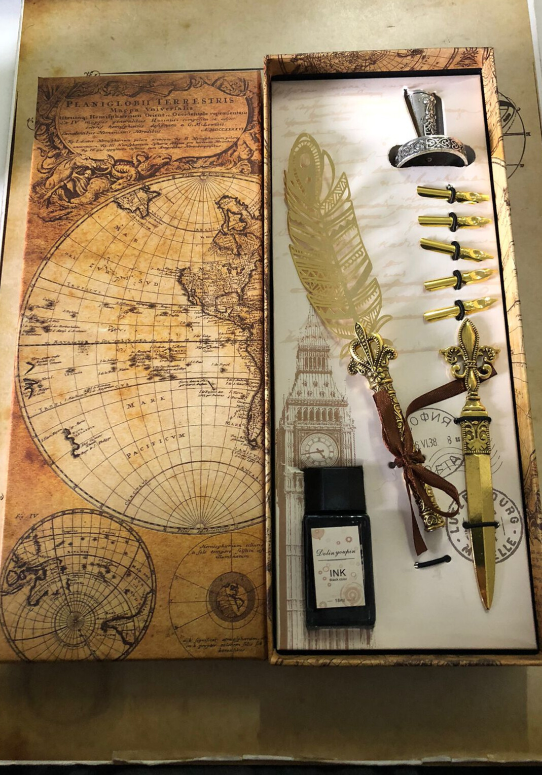 Kit Caneta Tinteiro Retrô Dourada