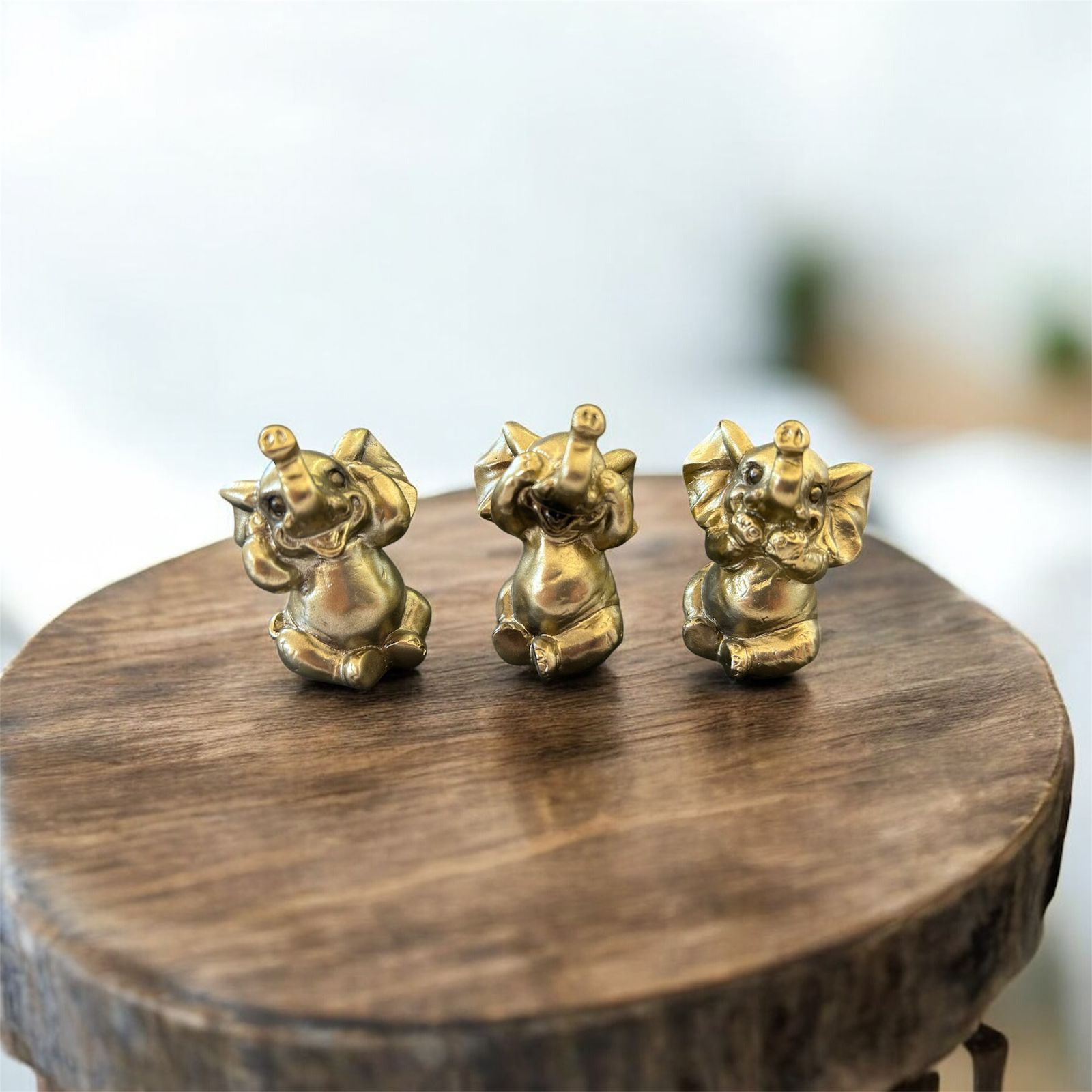 Este trio é mais do que decoração: é ensinamento, é lembrete sutil. Cada elefante guarda um portal — o da palavra, o da escuta e o da visão — convidando-nos a filtrar o que emitimos e recebemos. Eles ancoram uma energia de serenidade e discernimento, criando um campo leve onde pensamentos se tornam mais claros e a alma respira em paz.