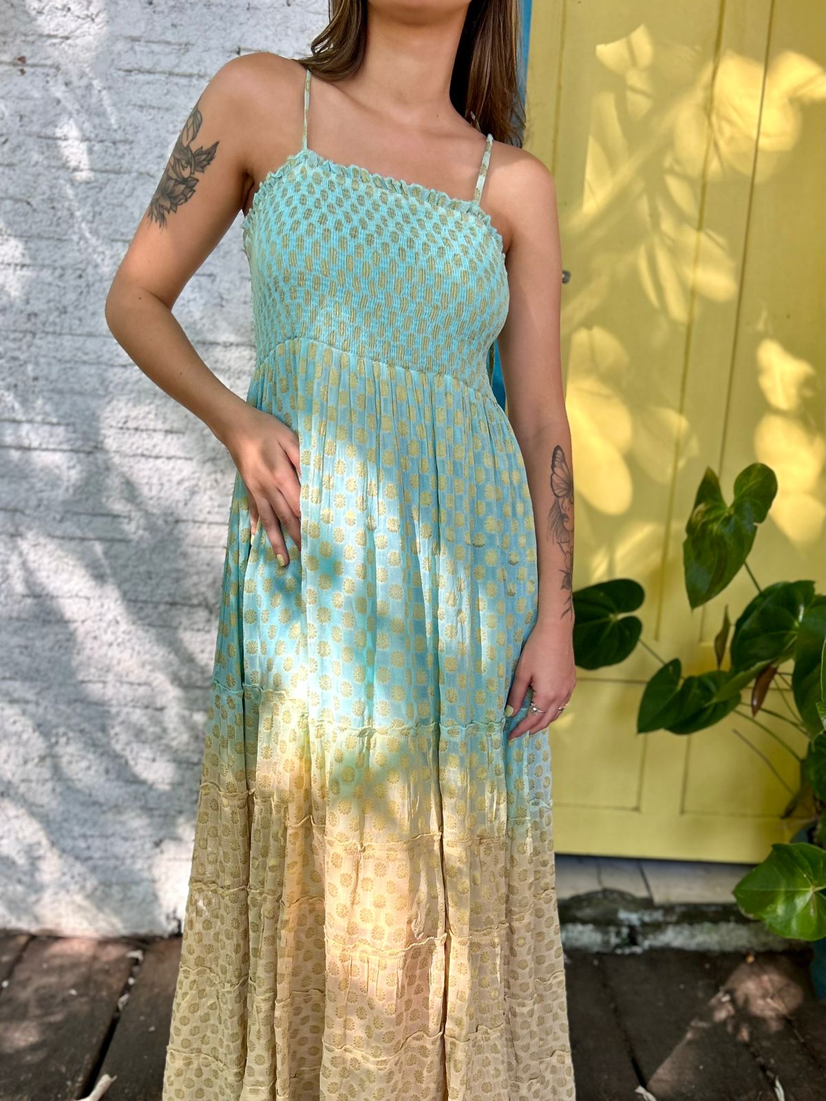 Vestido Lurex Longo - Ciano com Bege Tamanho M